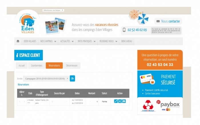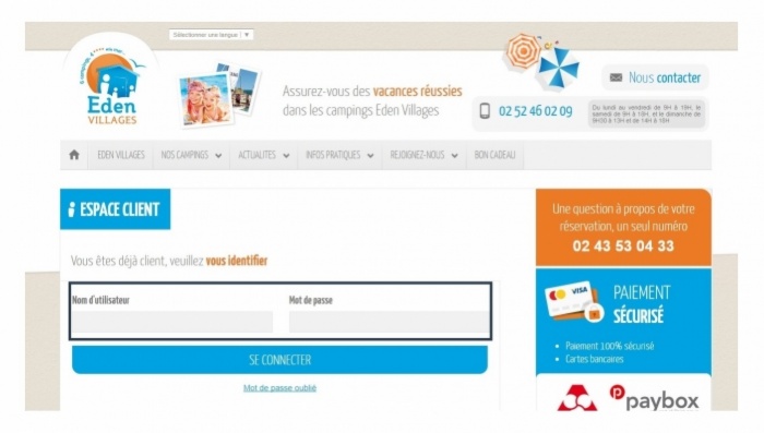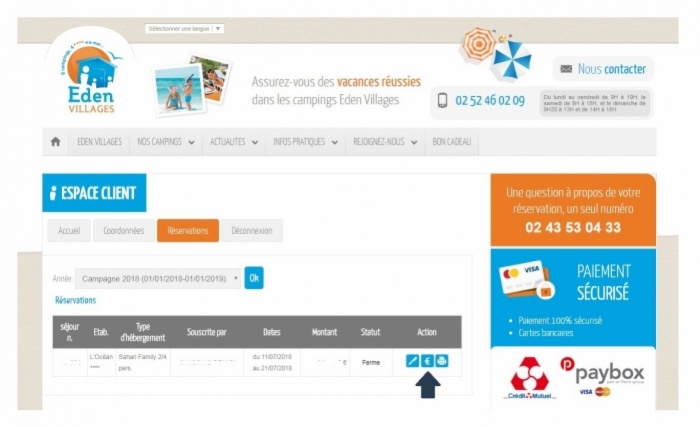En cas de difficulté pour procéder au règlement de votre séjour, contactez le Service de Réservation Eden Villages au 02 52 46 02 09 , par mail à l'adresse centrale[@]edenvillages.fr ou via le formulaire de contact .