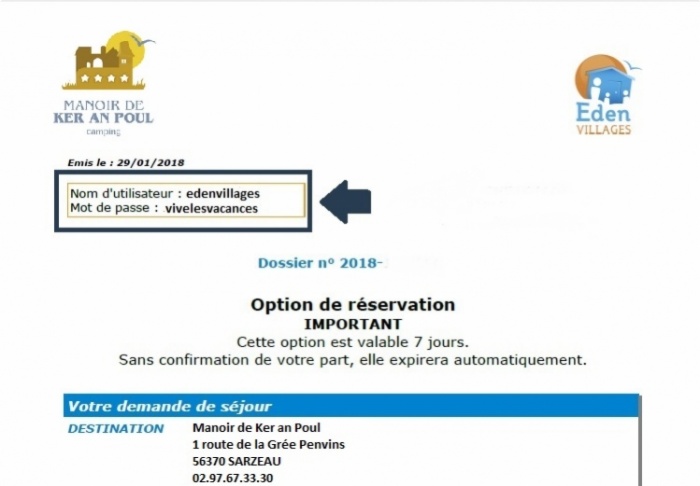 Ces informations figurent sur votre option ou confirmation de réservation comme le montre cet exemple.