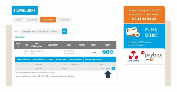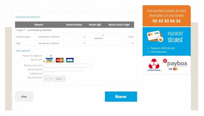 Renseignez les informations de votre carte bancaire (les 16 numéros, date d'expiration, le cryptogramme et le nom du détenteur de la carte) puis cliquez sur "Réserver" pour régler l'échéance de votre séjour. Le paiement est entièrement sécurisé via le système "Paybox".